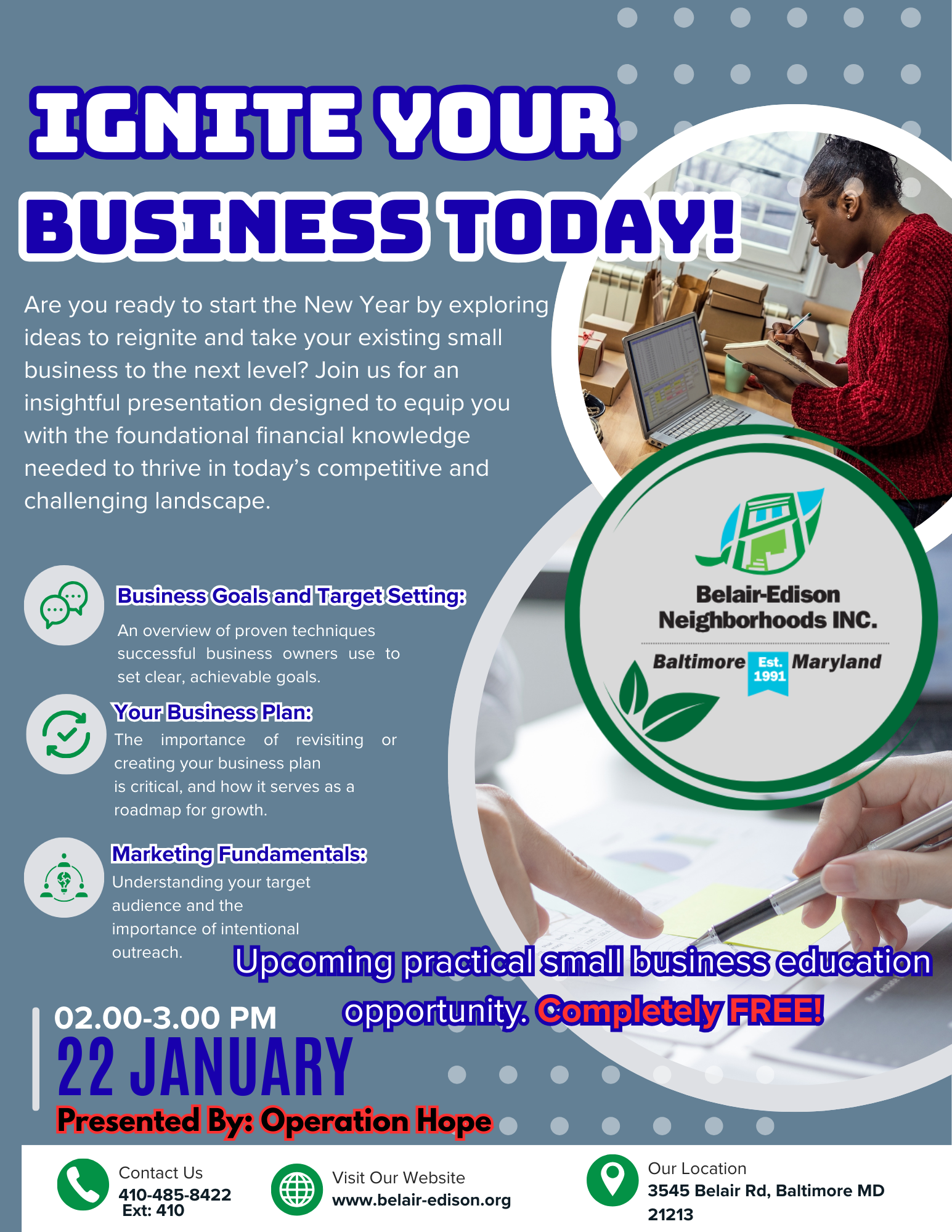Belair-Edison Neighborhoods INC 3545 Belair Rd, BaltimoreAre you ready to start the New Year by exploring ideas to reignite and take your existing small business to the next level?...